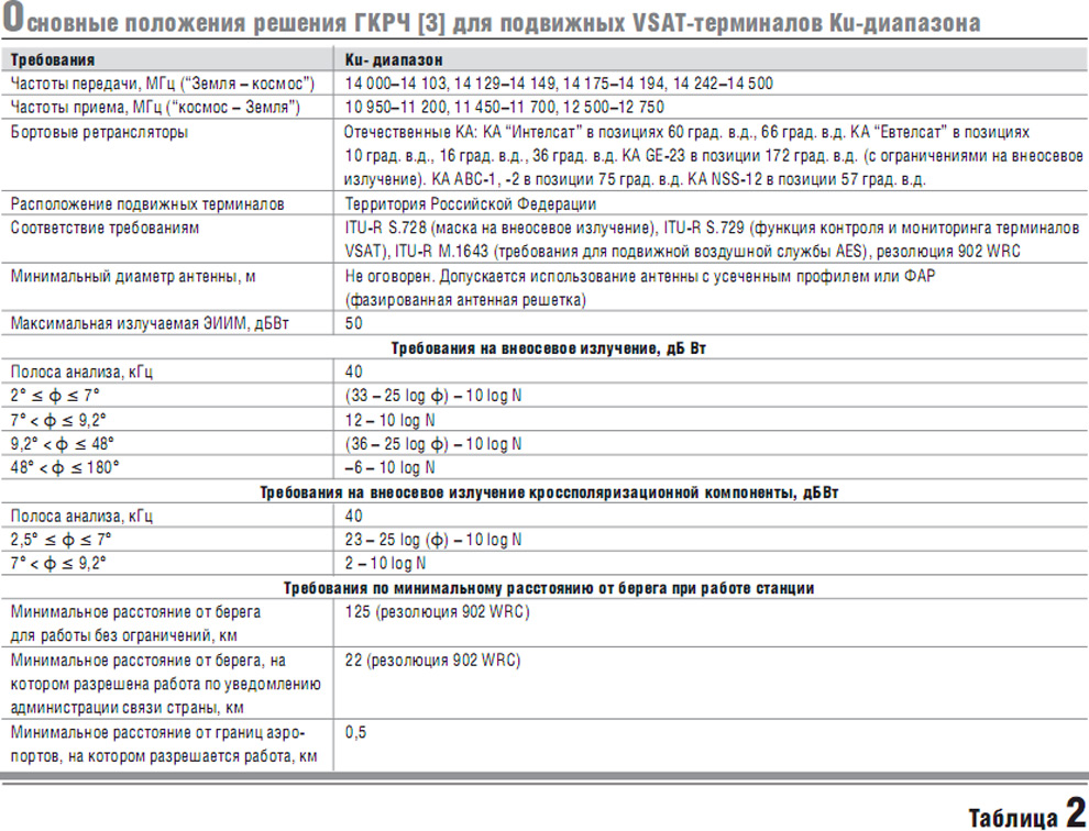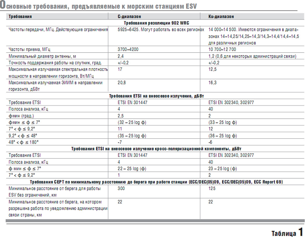 Каждое из этих направлений подвижного VSAT успешно развивается, причем системы морского VSAT — наиболее быстро растущее направление развития технологии подвижного VSAT. В табл. 1 приведены основные требования, предъявляемые к морским станциям ESV, работающим в С- и Ku-диапазонах, документами WRC, ETSI и СЕРТ. В настоящее время Администрация связи России принимает конкретные меры по упрощению процедуры получения разрешений на использование VSAT-станций, устанавливаемых на подвижных объектах.