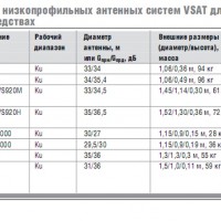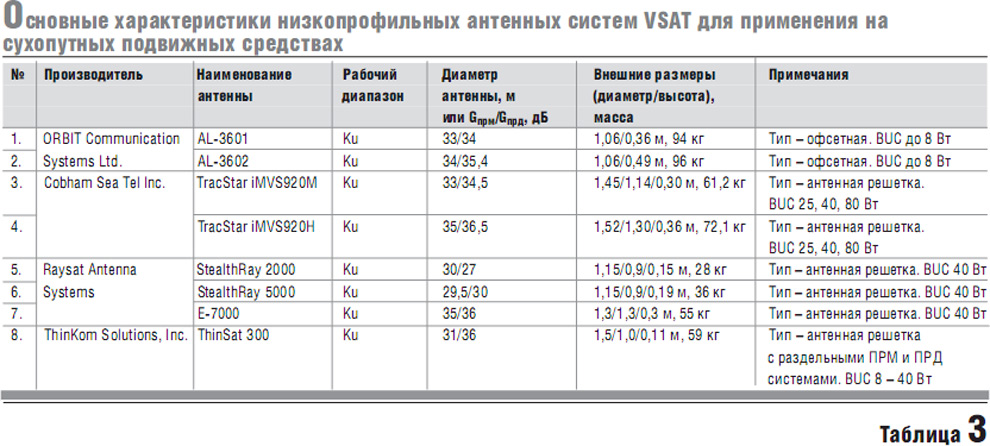 Для использования в подвижных сухопутных VSAT-терминалах разработаны антенные системы, имеющие малые размеры по вертикали. Конструктивно такие системы могут быть выполнены в виде вырезки из параболы с малой высотой зеркала либо в виде антенной решетки с несколькими приемными и передающими панелями, размещенными параллельно друг другу, в результате чего уменьшается вертикальный размер конструкции. Основные характеристики некоторых таких антенн для наземного использования приведены в табл. 3.